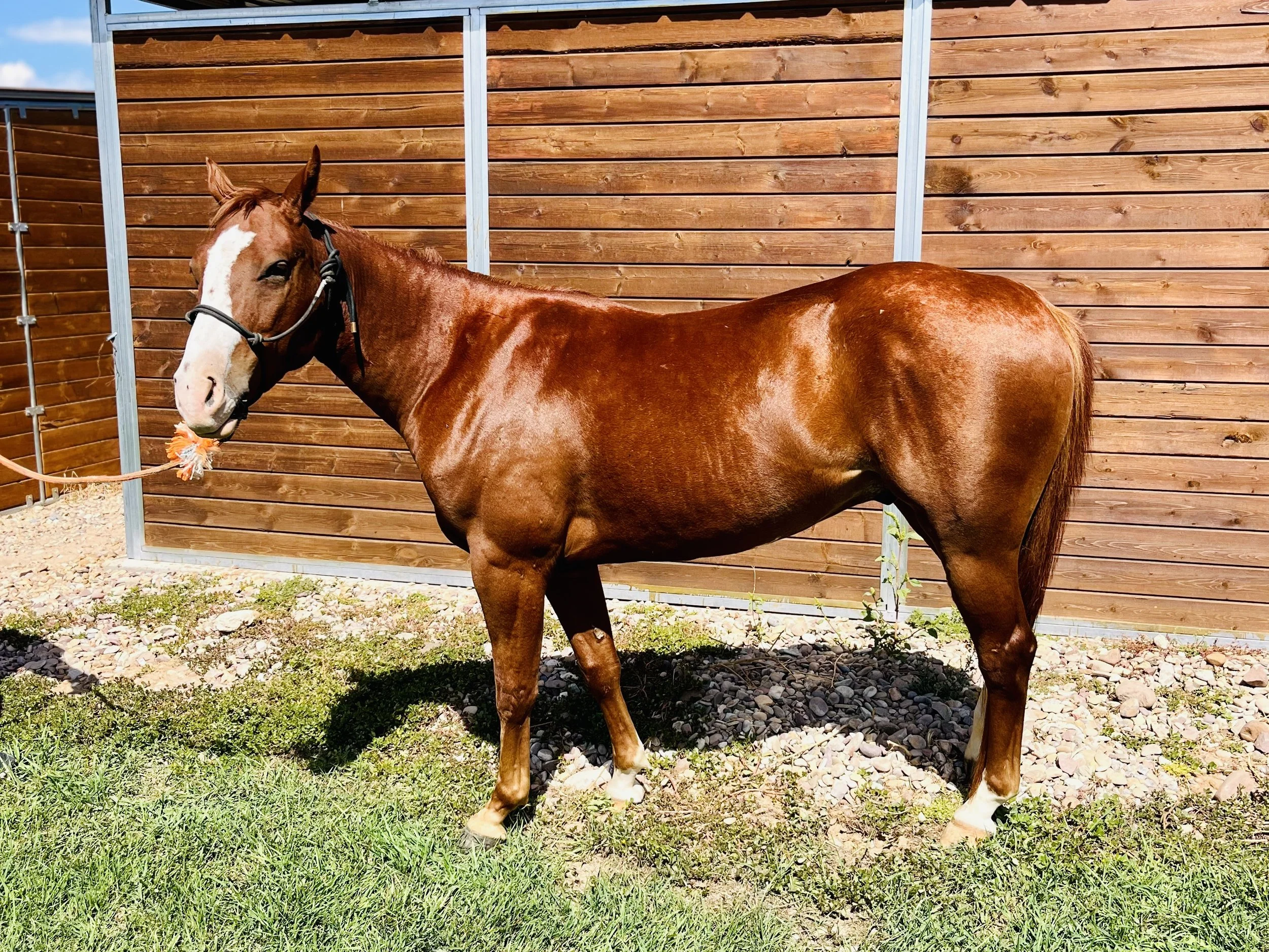 This unique looking bay is a Gunner baby. His pedigree is one of a kind and a kick-out to look at. His ball face and striking sleek color make him an eye-catcher, indeed. He stands perfectly for a farrier and has good bones and feet, which is a plus. He has never taken a lame step and travels well. Whiteclaw is good-minded and gentle to be around. He is patient enough to let you catch him in the field, hop on his back and ride him in with his blanket on and only a halter. He is the type of horse you would feel comfortable to have your children go catch without any issues. He has spent some time trail riding and sorting cattle in the field. You can leave him turned out for a week and saddle him up to go ride, with no issues. He’s not the type of horse that is going to get fresh on you. He is well mannered and docile. He is like riding a Cadillac and anyone can ride him. Whiteclaw has been started on the hot heels and feels extremely natural to ride and has one year of professional training on him. He is young, but eager to lear and has tons of potential. Whiteclaw has been a fantastic horse for us! This horse is safe, gentle and sound.